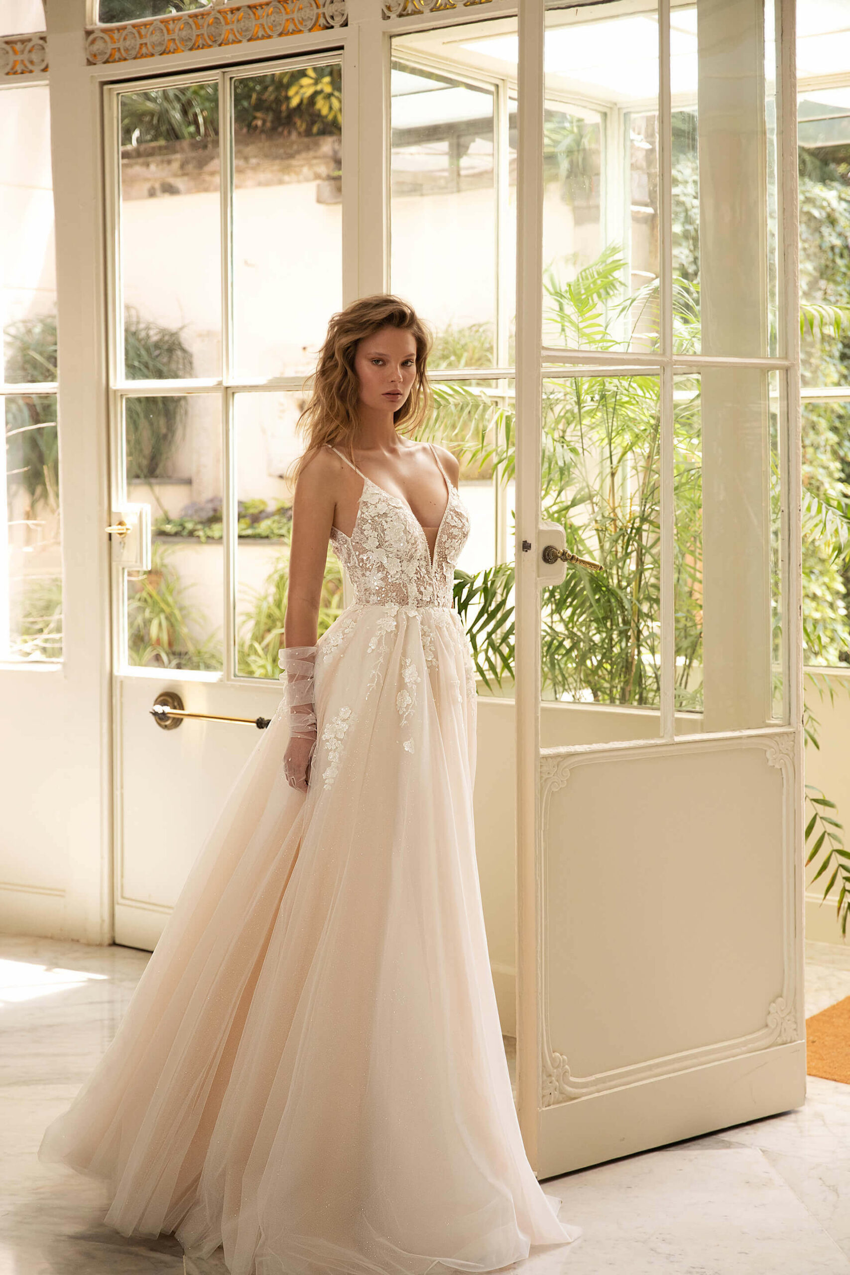 Vestido de novia con corsé escote en V rizado decorado con bordados de pedrería, cristales, lentejuelas, aplicaciones y drapeados. Las mangas aireadas con muñequeras fruncidas hacen que el vestido sea más romántico. La falda cosida suavemente está hecha de tul ligero de varias capas.