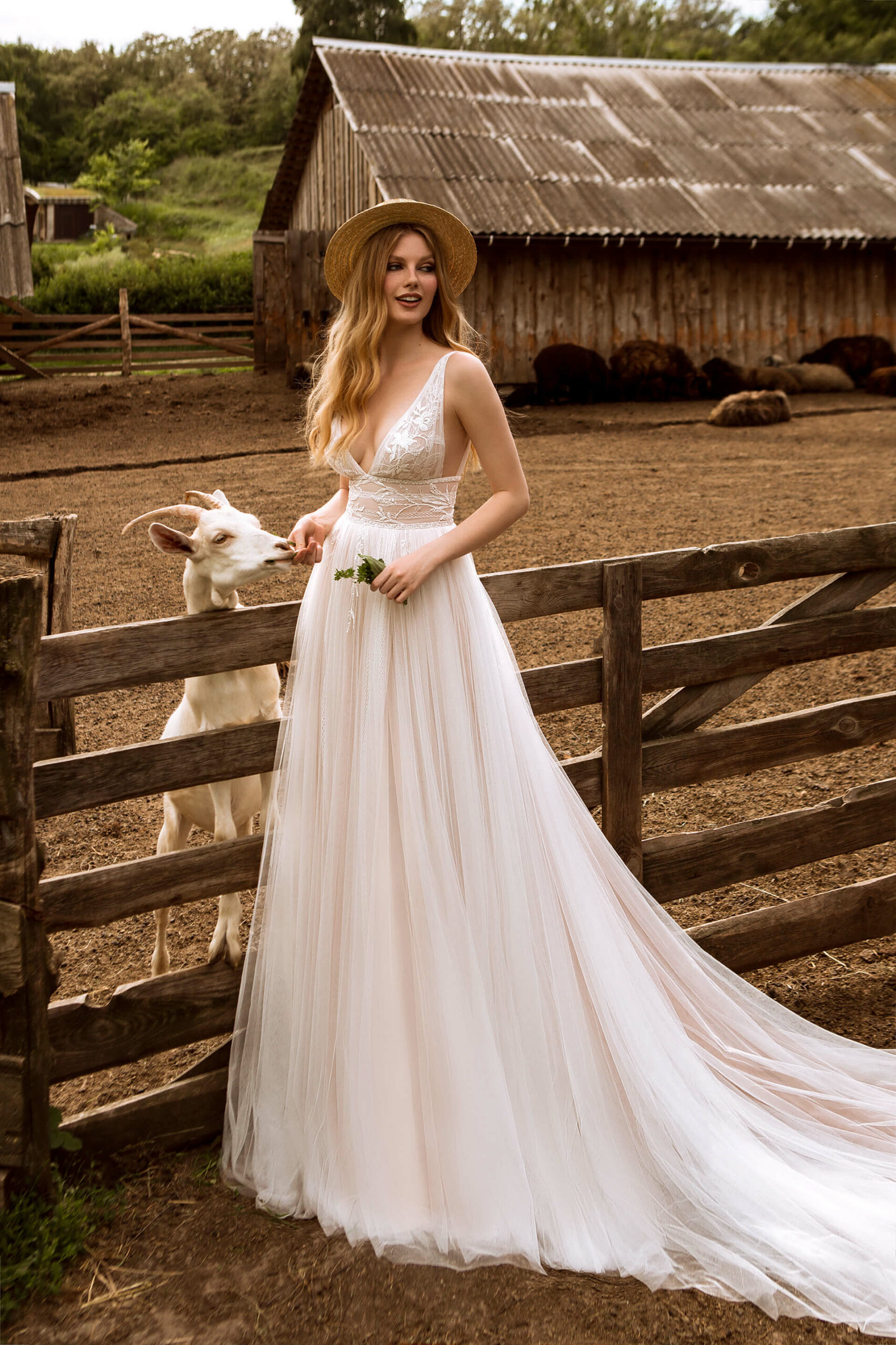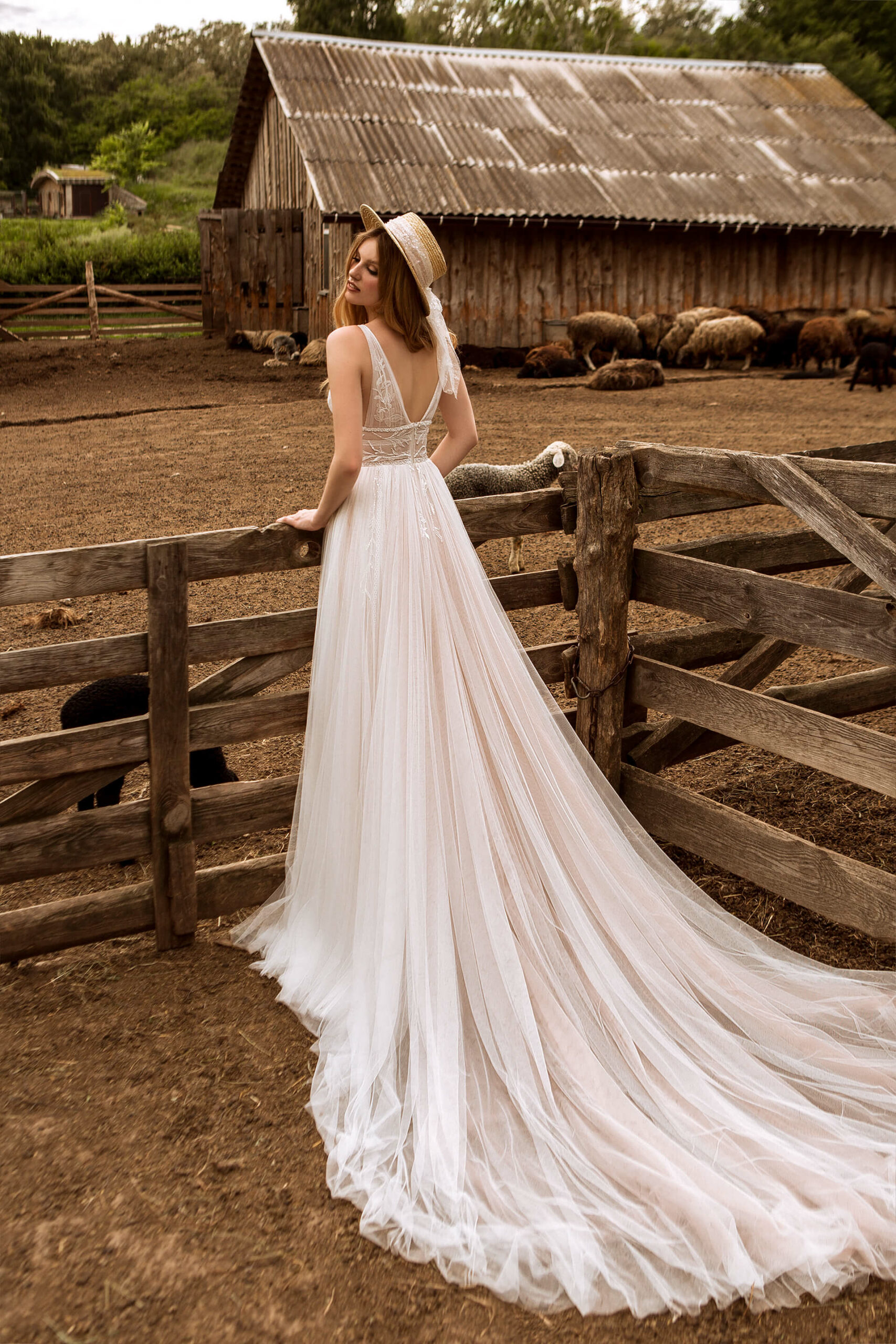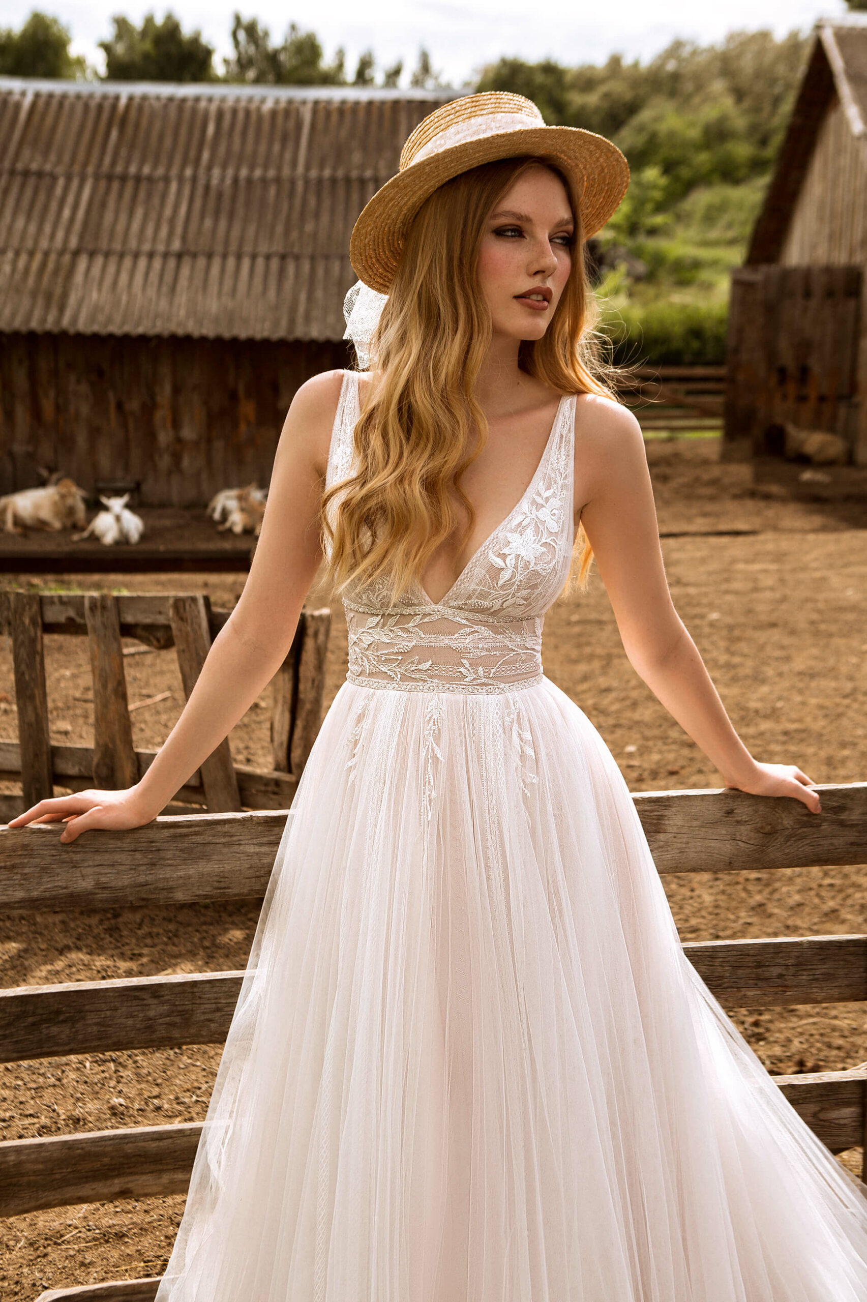 Romántico vestido de corte A con un estilo bohemio. Un bonito escote en V que remarca la cintura con su pronunciado fajín. Su inusual color rosado y la combinación de bordados florales con guipur y detalles de brillo hacen este vestido único.