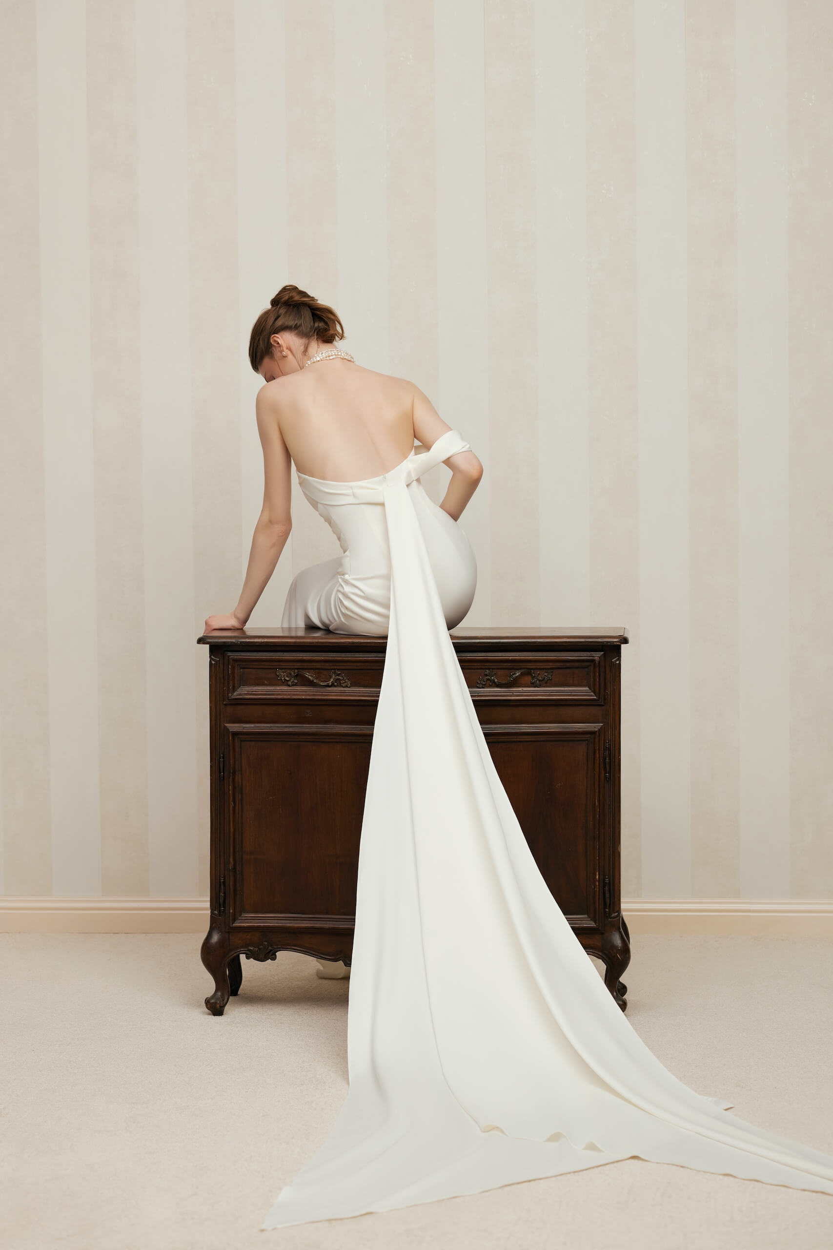 Con una delicada tira de un solo hombro, este vestido añade un aire de modernidad y distinción. El detalle de la cola con lazo actúa como un acento distintivo, elevando el look general a nuevas alturas de estilo y gracia.