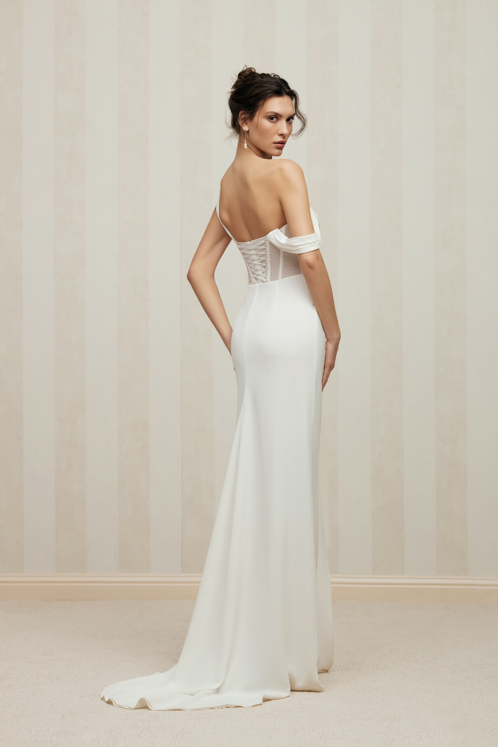 Este sofisticado vestido de novia presenta una silueta recta con un corsé y drapeados que evocan un estilo clásico y atemporal. El corsé, confeccionado en malla con copas y tirantes, acentúa sutilmente el busto. La parte trasera del corsé se ajusta con un elegantel lazada, añadiendo un toque de sofisticación clásica.