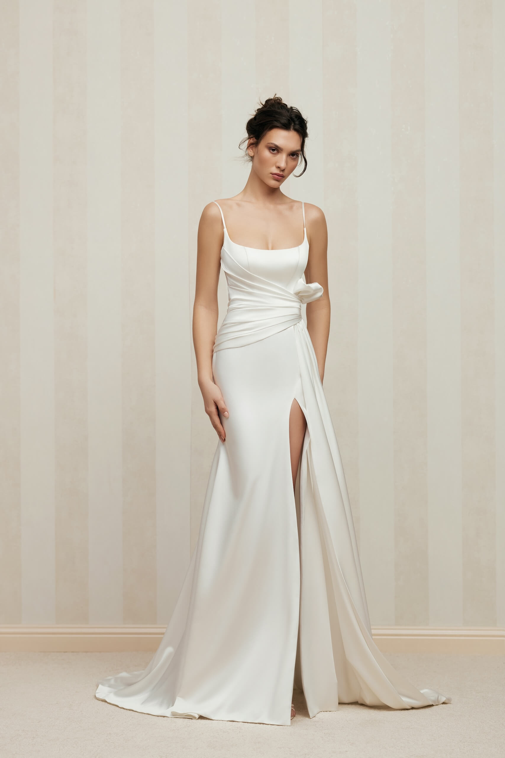 Este delicado vestido de novia de silueta sirena, confeccionado en suave y glamurosa seda, irradia elegancia. Su corsé presenta un escote recto, ligeramente redondeado, y delicados tirantes finos. El estilo minimalista se complementa con líneas gráciles y un drapeado equilibrado en la cintura y las caderas.