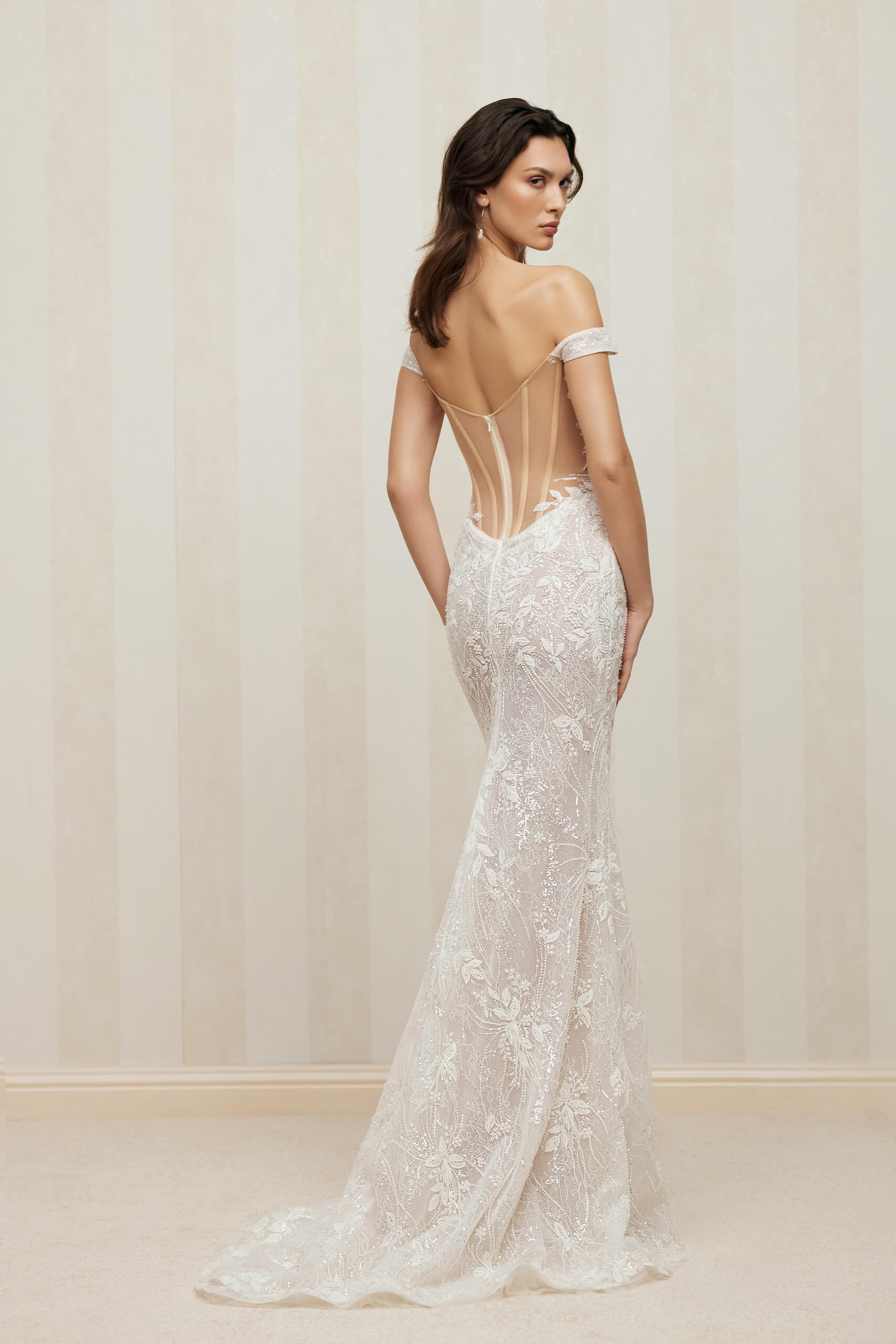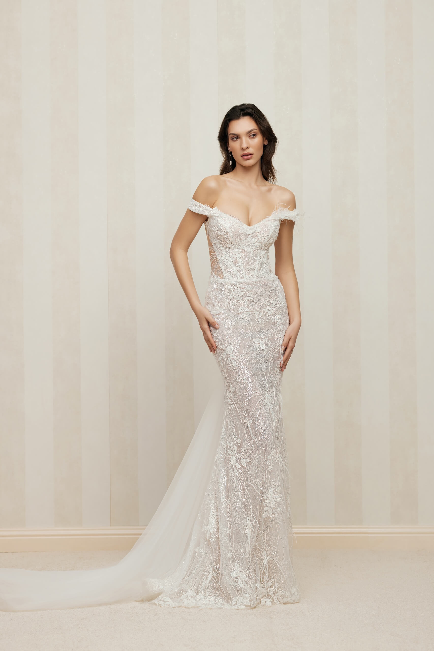 Un diseño elegante y seductor que resalta la figura con una silueta sirena ceñida. Presenta un corsé con un ligero escote en V y lados y espalda en transparencia, adornado con tirantes en cascada que aportan un toque romántico. La falda se extiende suavemente en la parte posterior, complementada por una cola desmontable en tul suave, ideal para crear dos looks en uno. Confeccionado en encaje Chantilly y una capa superpuesta de tul brillante, Deslumbra con detalles de encaje floral, lentejuelas, cuentas y plumas. Un vestido que combina sensualidad y elegancia para tu día especial.