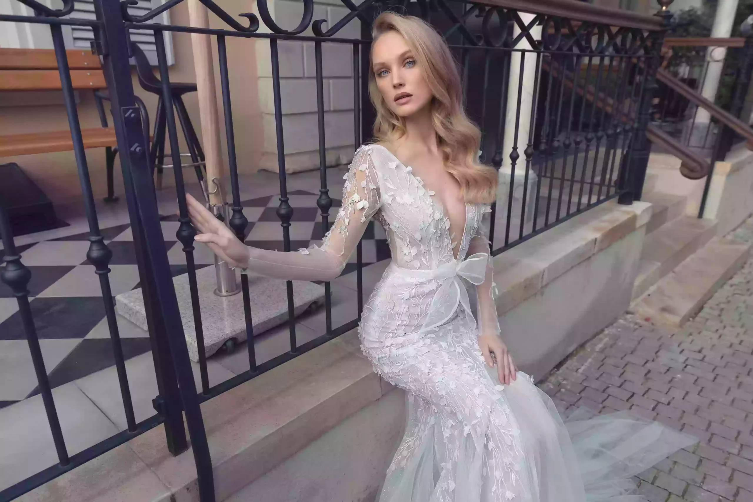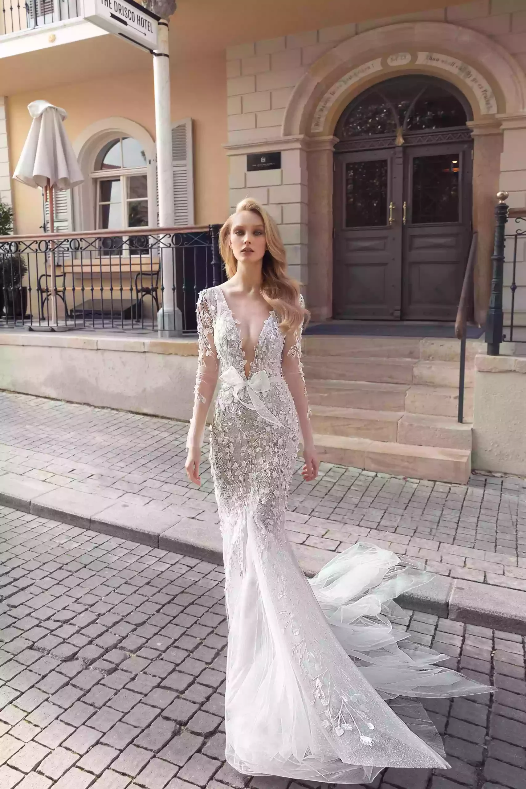 Espectacular vestido de novia de corte sirena, elaborado con un delicado tul semitransparente cubierto de pequeñas aplicaciones de bordados florales y pétalos con efecto 3D. Su fina manga efecto tatuaje aporta elegancia al vestido, y permite que los bordados bajen por el hombro.