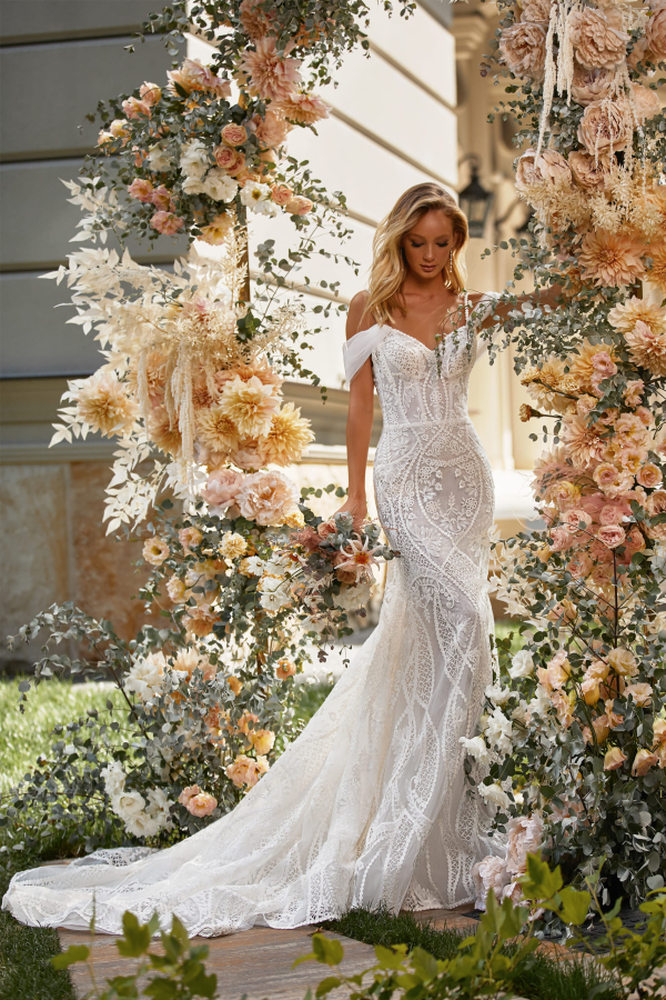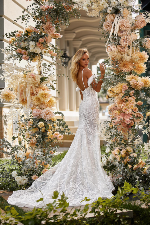 Este vestido de corte sirena aporta un look bohemio y ligero con su inusual encaje geométrico. El contraste de una base con un guipur blanco aporta un efecto de relieve y transparencias, realzando la figura.