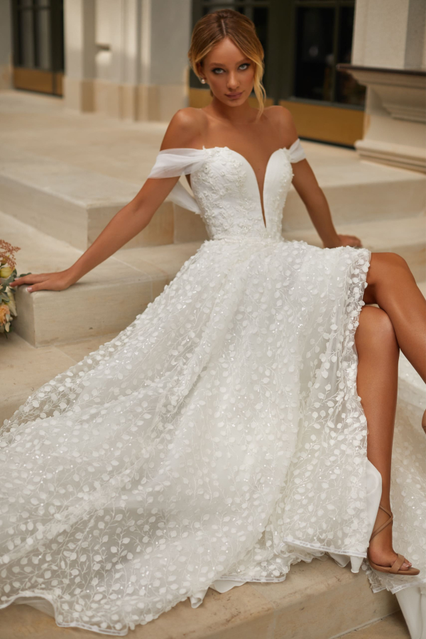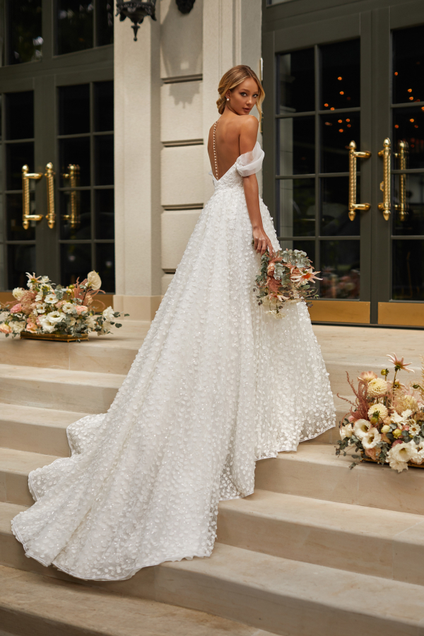 Romántico vestido de corte A cubierto de delicados pétalos en 3D.