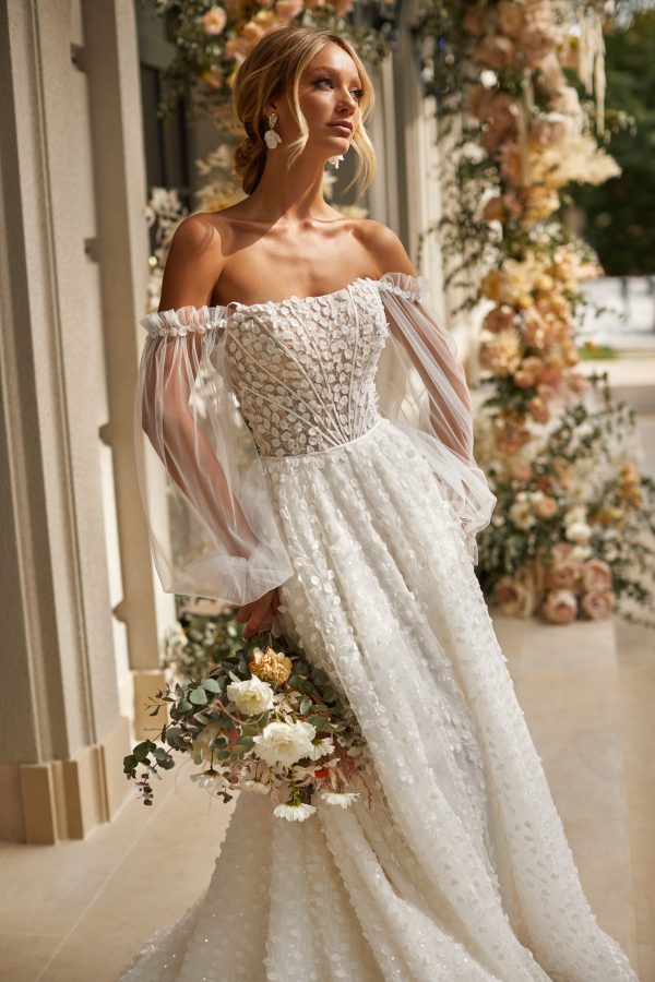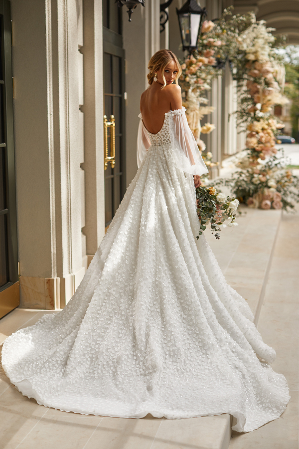 Un romántico vestido de corte A cubierto con pequeñas flores en 3D, dándole un toque romántico y actual.