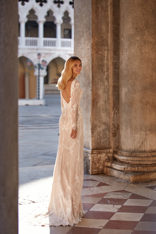 Este vestido de corte sirena elaborado con delicado chantillí y pedrería realza la figura, aportando un toque sexy y desenfadado con su pronunciada abertura en la pierna.
