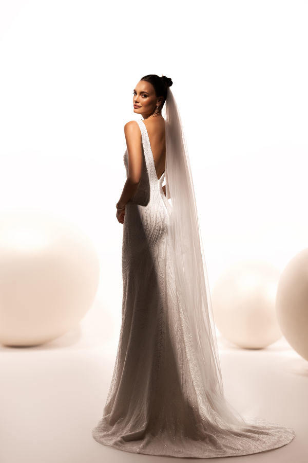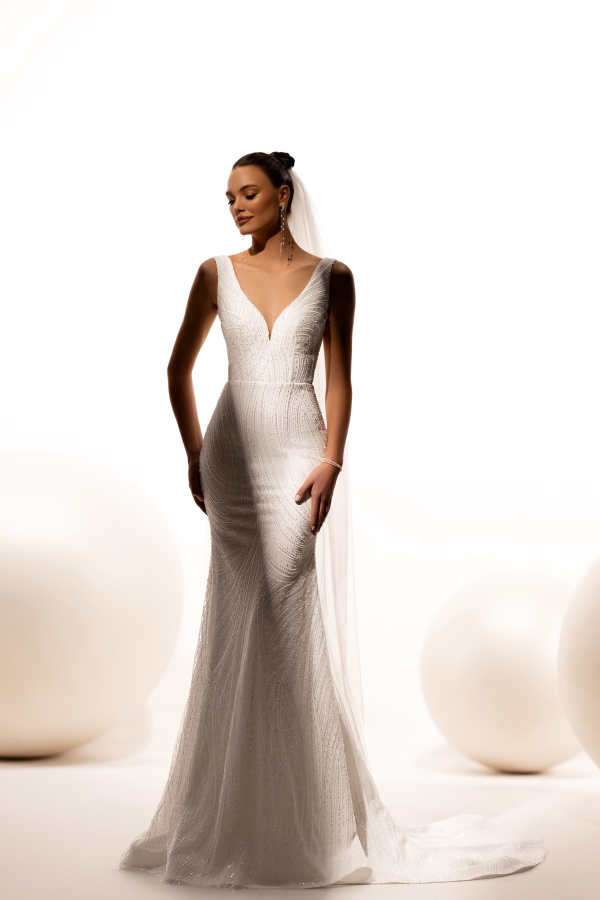 Espectacular vestido de novia de estilo sirena elaborado con pedrería. El bordado en forma lineal estiliza la figura, aportando un toque elegante y actual.