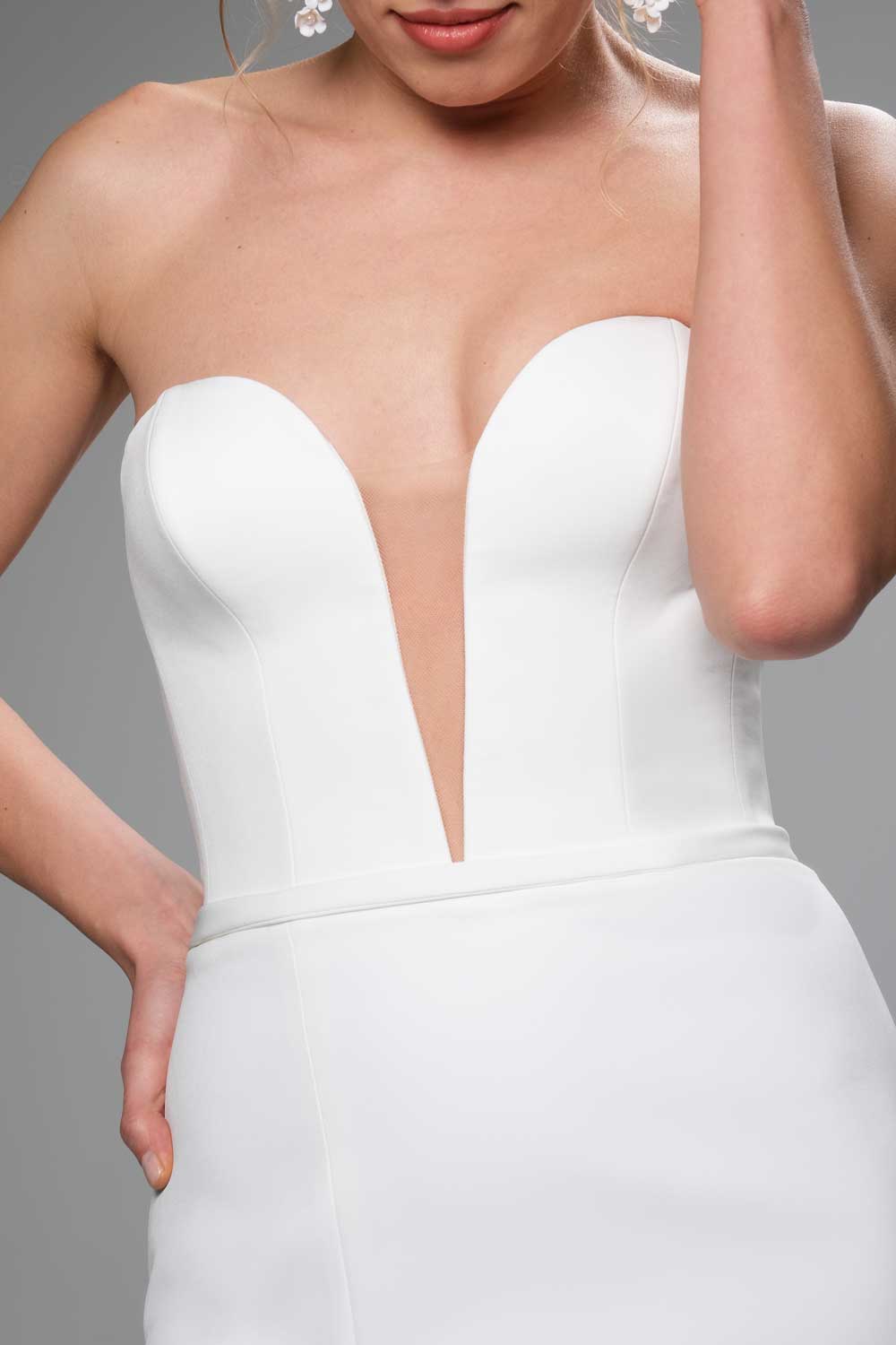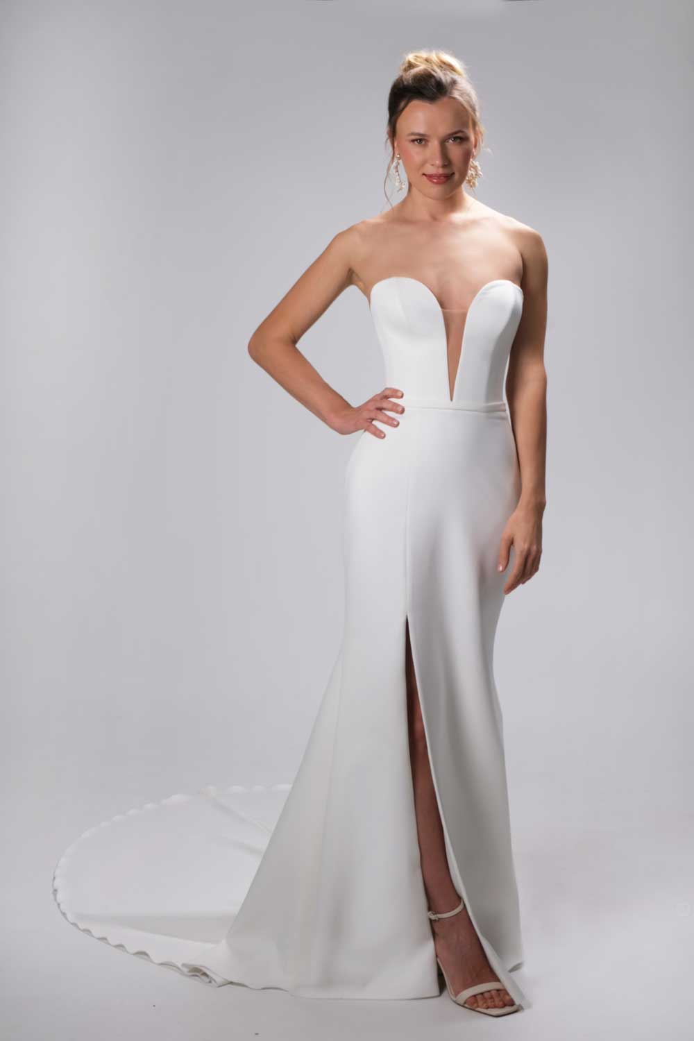 Elegante y sensual vestido de novia de estilo minimalista y corte sirena elaborado en un crepe elástico de alta calidad. Cuenta con un cuerpo ajustado efecto corse y pronunciado escote corazón acabado en forma de V. Su marcada falda de corte sirena estiliza y marca la figura. Puede realizarse con abertura en la falda, dándole un toque moderno y atrevido.