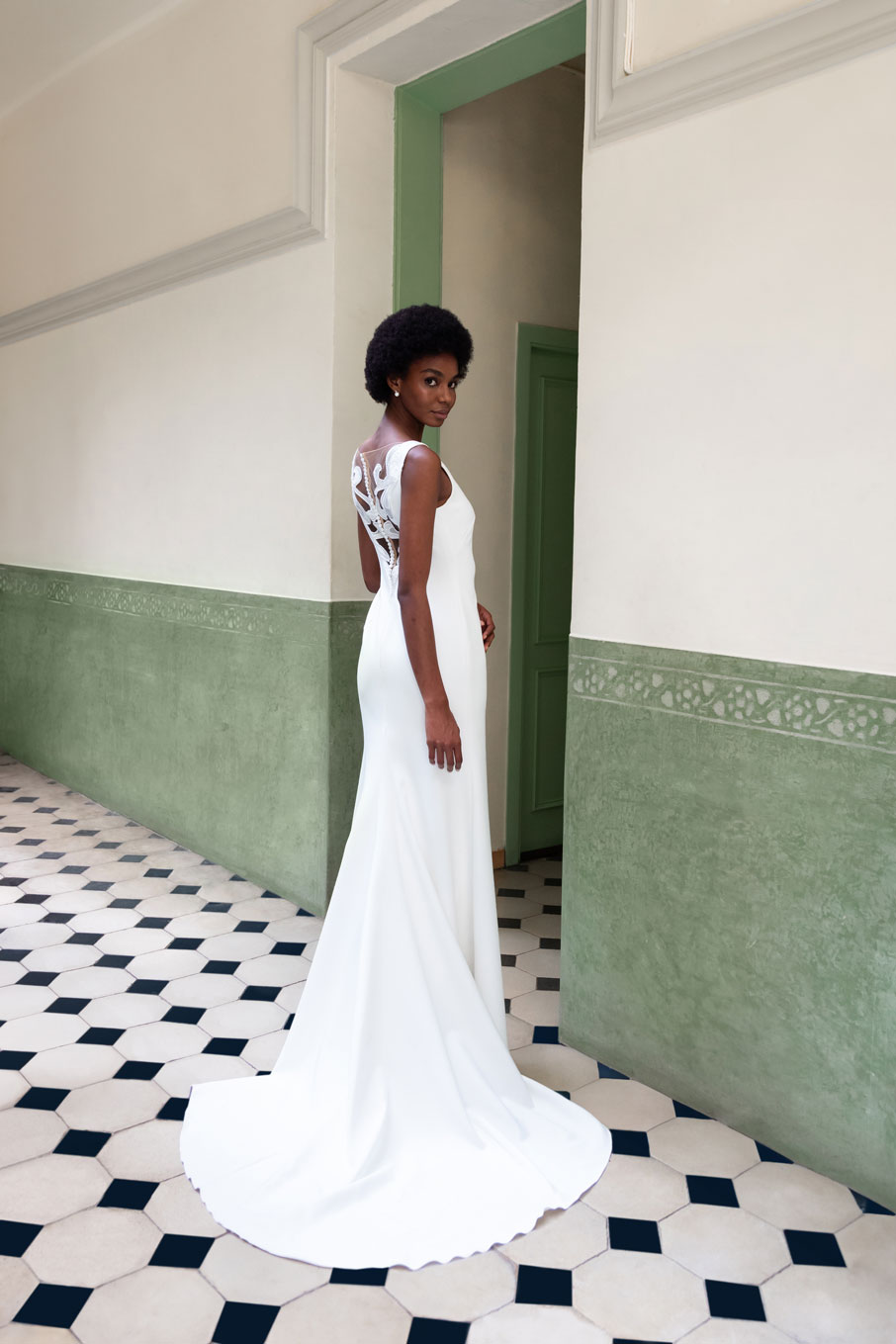 Este impresionante vestido de novia combina la elegancia minimalista con detalles cautivadores para crear una apariencia verdaderamente deslumbrante. Confeccionado en crepé de alta calidad, su corte sirena abraza las curvas con gracia y elegancia, realzando la figura de la novia de manera favorecedora y sofisticada.