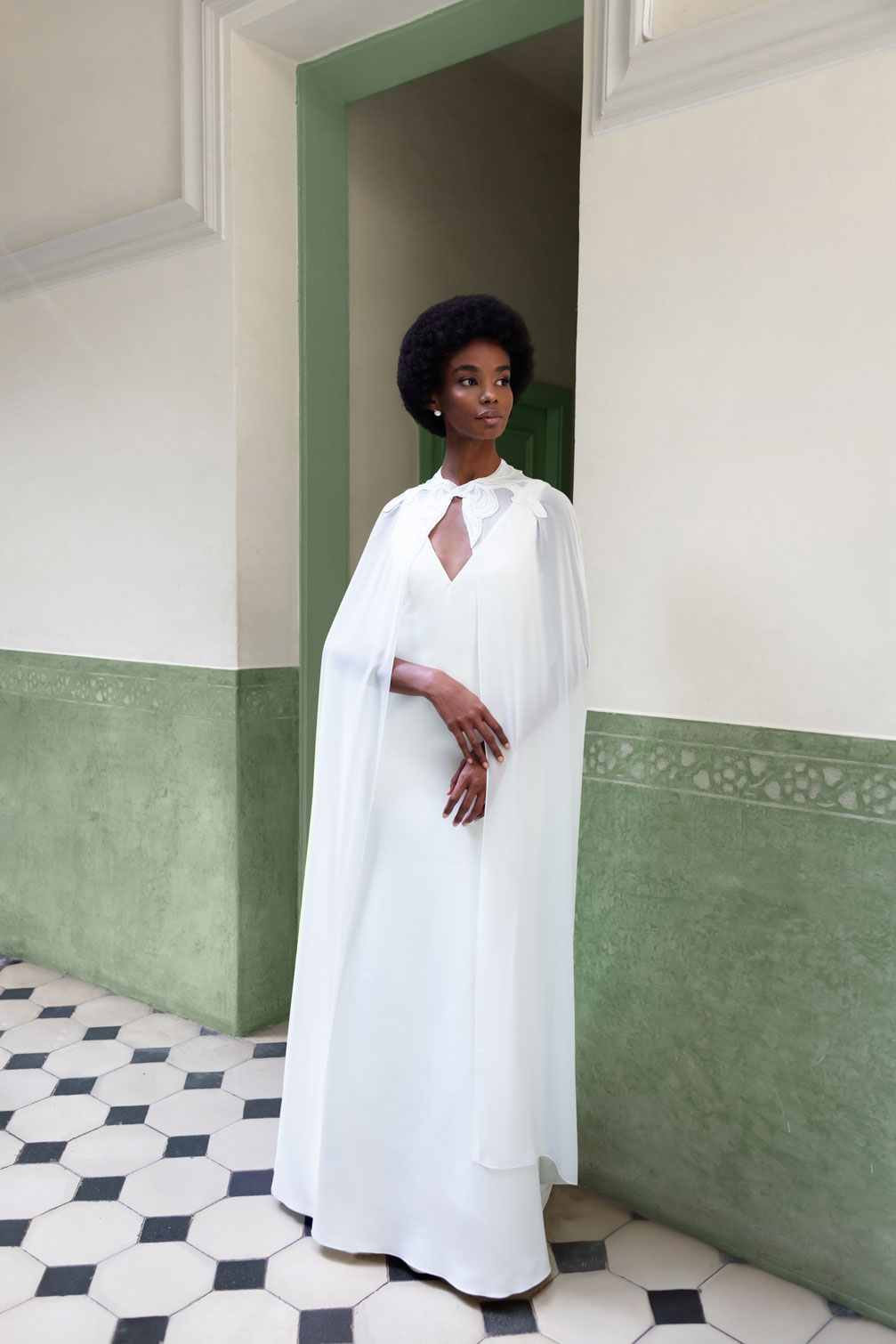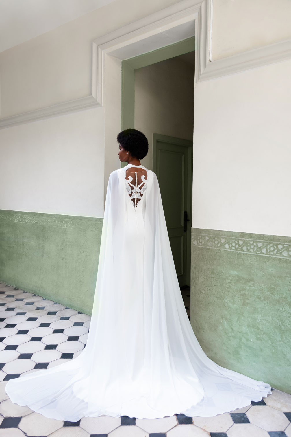 Para añadir aún más elegancia, este vestido se puede combinar con una capa larga de gasa. Esta capa está elaborada con un tejido muy fluído, añadiendo un toque de movimiento y elegancia a su apariencia. Además, las aplicaciones de encaje en el cuello de la capa complementan perfectamente los detalles de encaje en la espalda del vestido, creando una armonía encantadora entre las dos piezas.