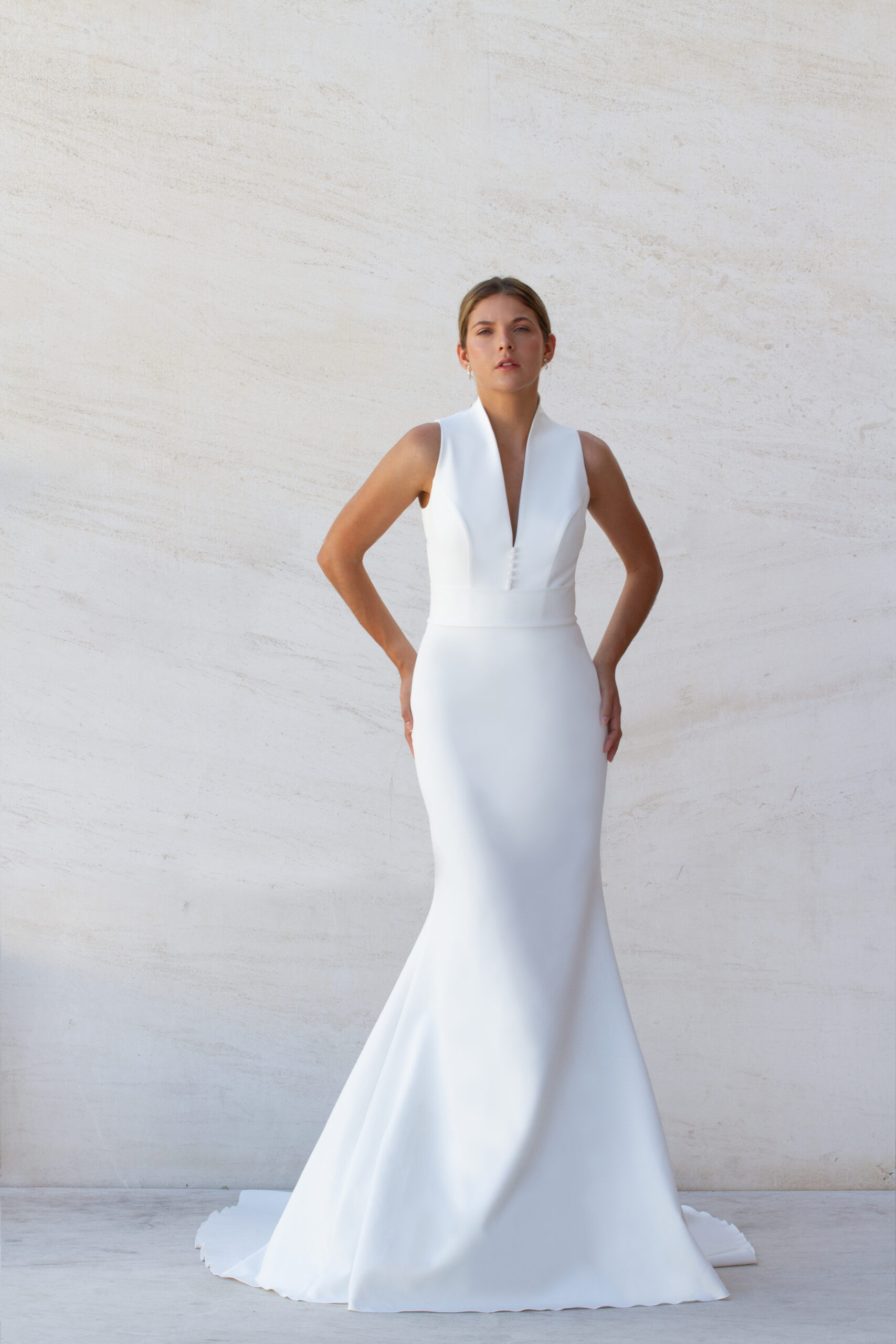 En resumen, este vestido de novia es una obra maestra de diseño minimalista que combina elementos clásicos y modernos de manera armoniosa. Con su original escote en V, fajín, detalle de botones y cola espectacular, este vestido garantiza que la novia brille con una belleza incomparable en su día especial.