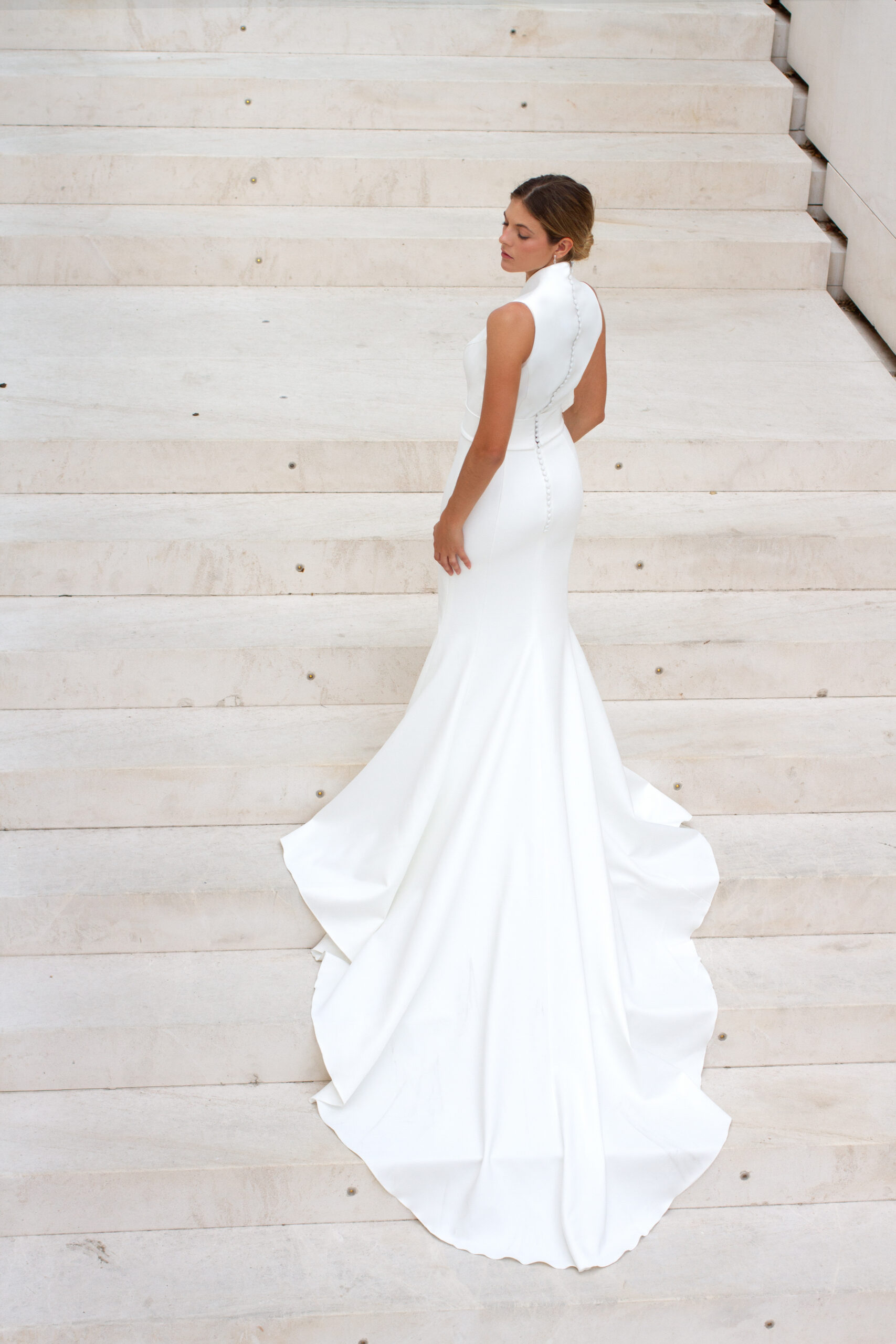 El detalle de los botones a lo largo de la parte trasera del vestido añade un encanto clásico y romántico, creando un efecto visual encantador que complementa la estética minimalista del diseño. Estos botones, cuidadosamente colocados, agregan un toque de nostalgia y romance al conjunto, creando un detalle memorable y distintivo.