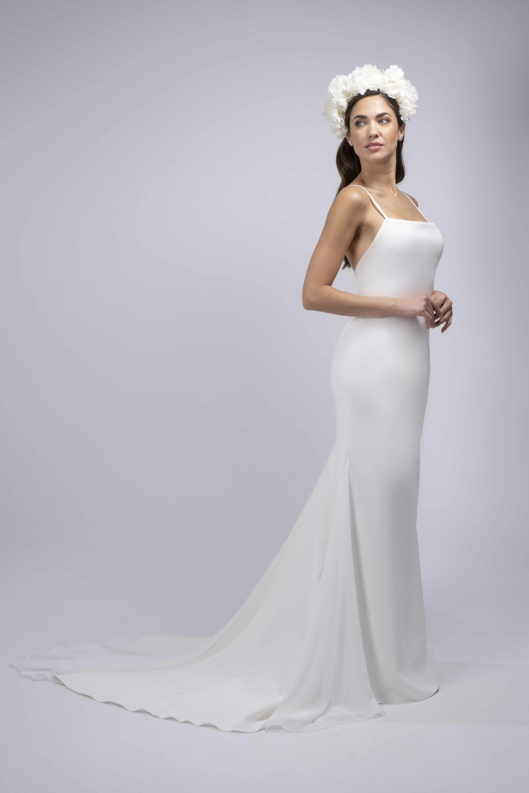 Elegante y sofisticado vestido de novia de estilo minimalista y corte sirena. Está elaborado con crepé elastizado de alta calidad, que permitirá que se ciña y realce la figura.