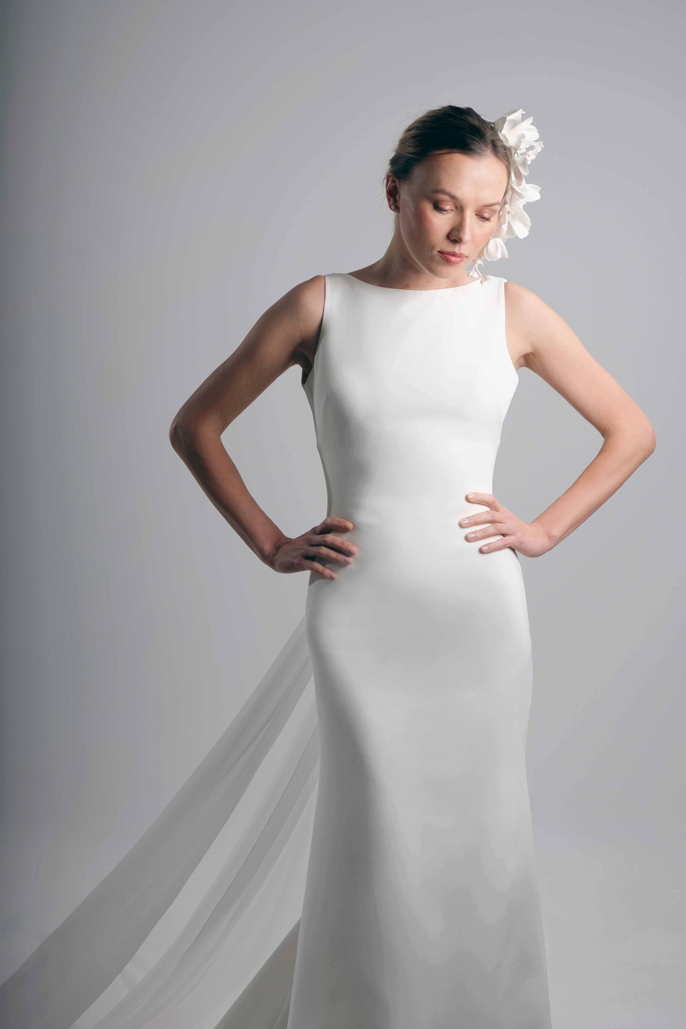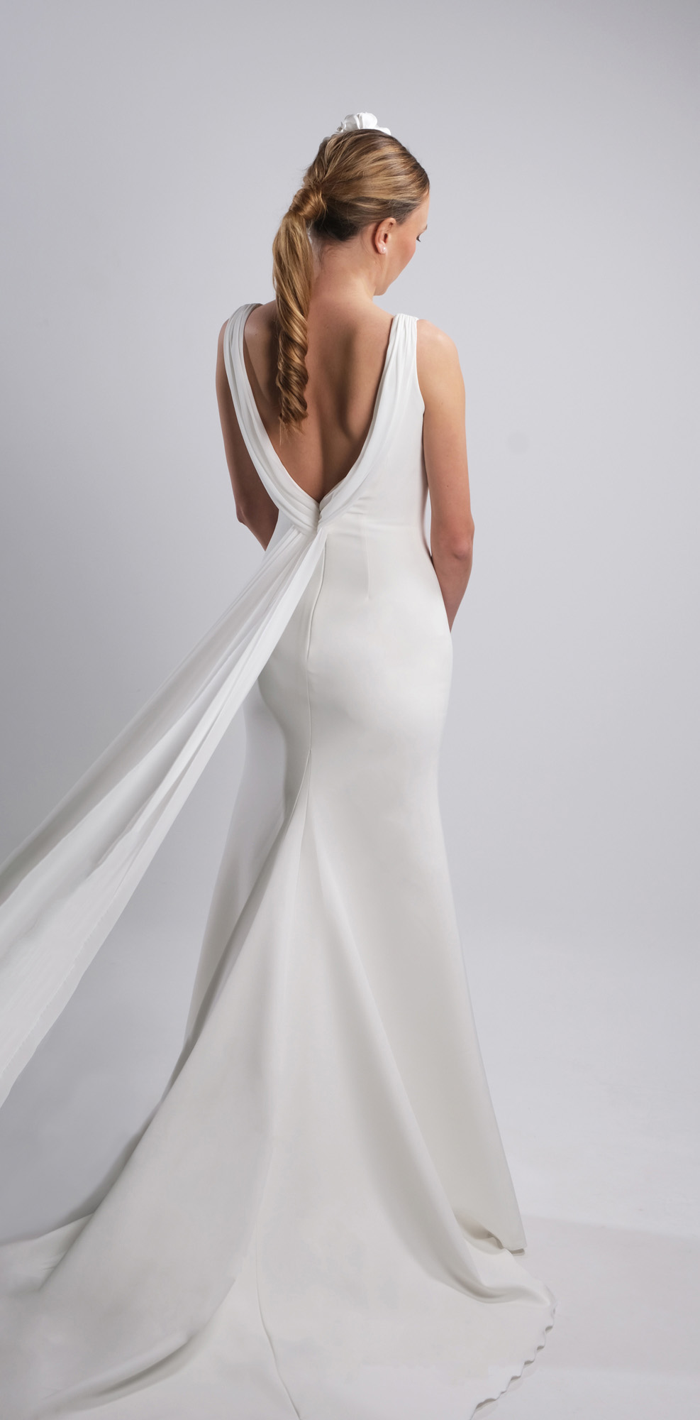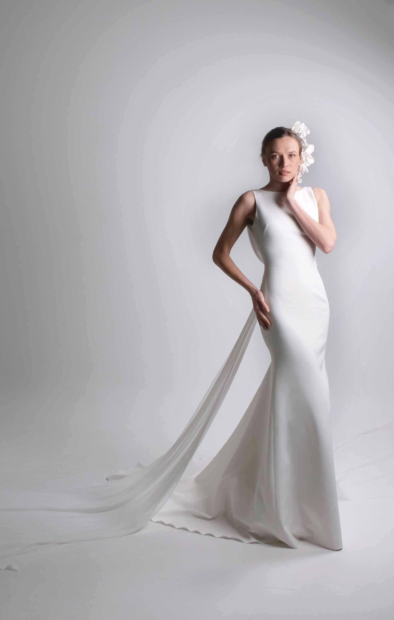 Elegante vestido de novia de estilo minimalista elaborado en crepe de alta calidad.
