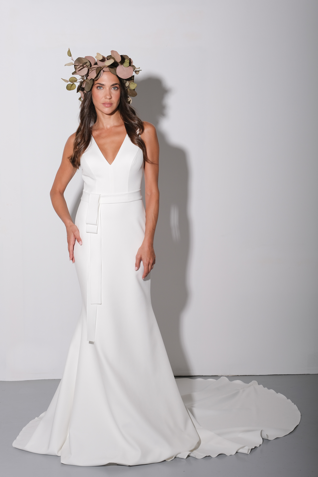 Silueta de sirena y blanco ivory con ajuste en la cintura, hacen de Monet la elección de vestido de novia de mujeres que buscan algo clásico y elegante. Diseño de alta costura con escote y espalda en V y sin mangas para un toque femenino y más minimalista.