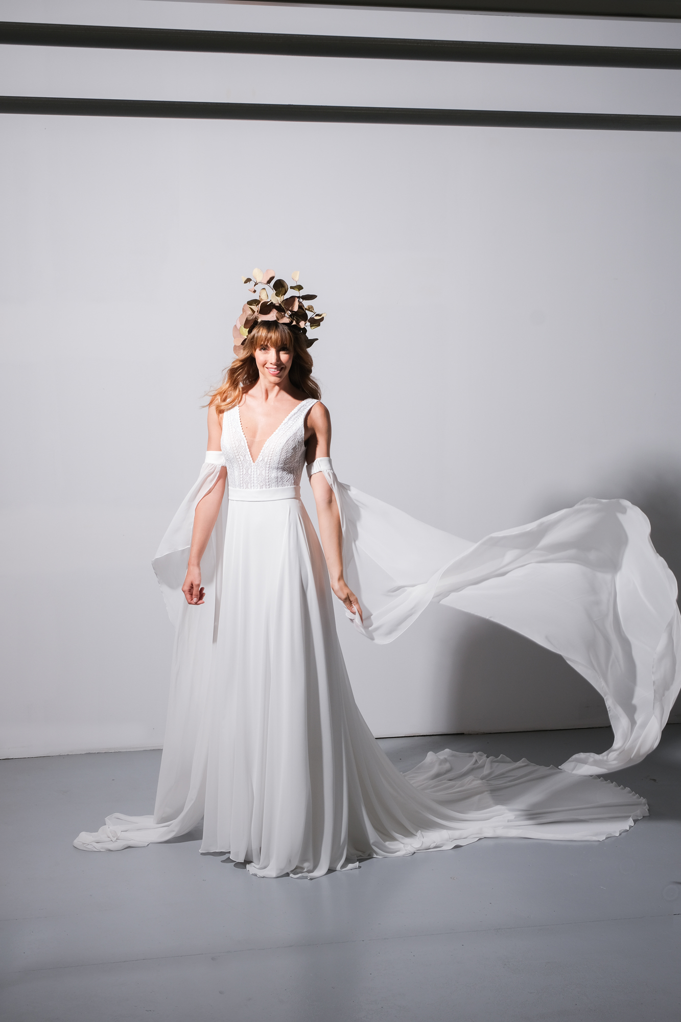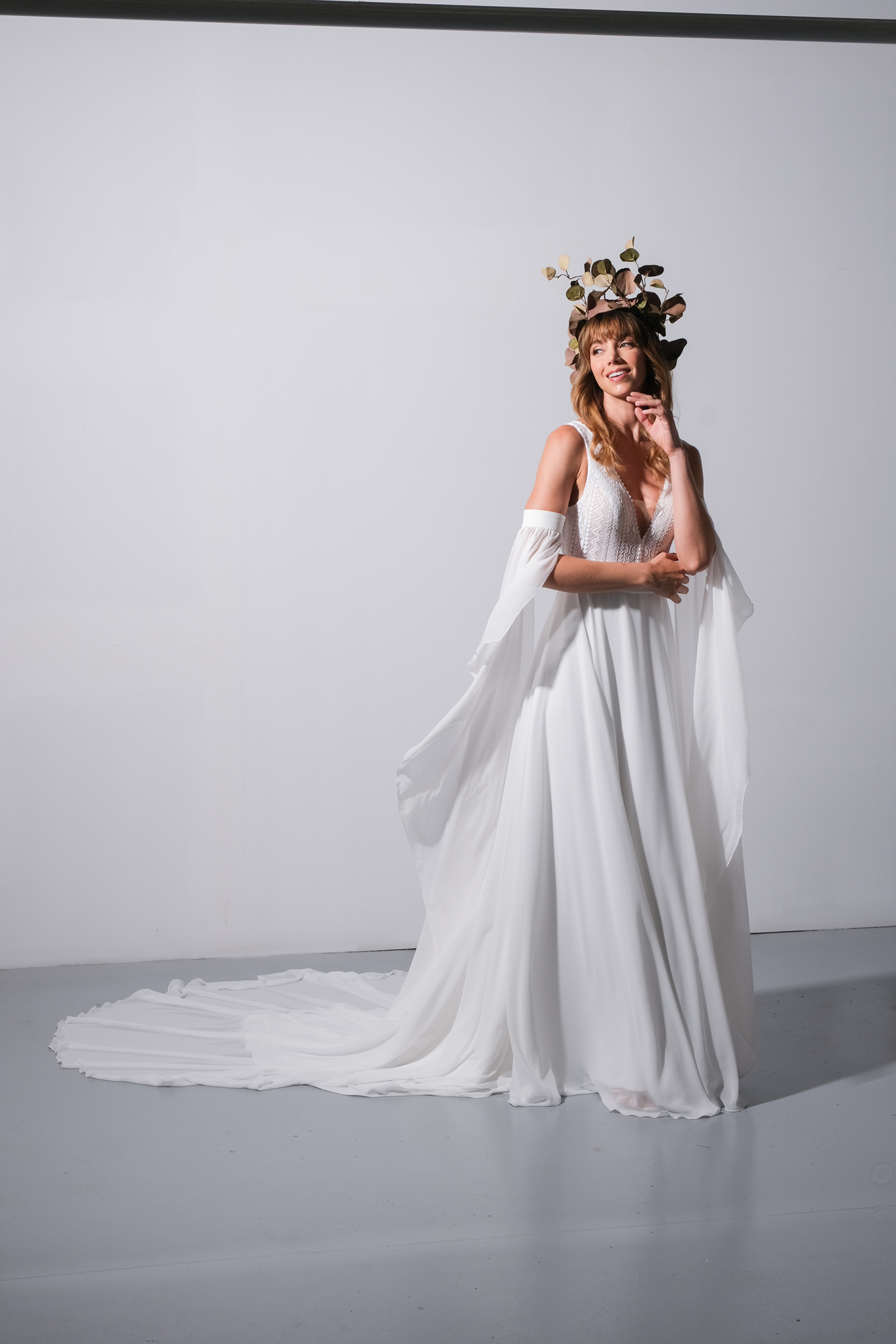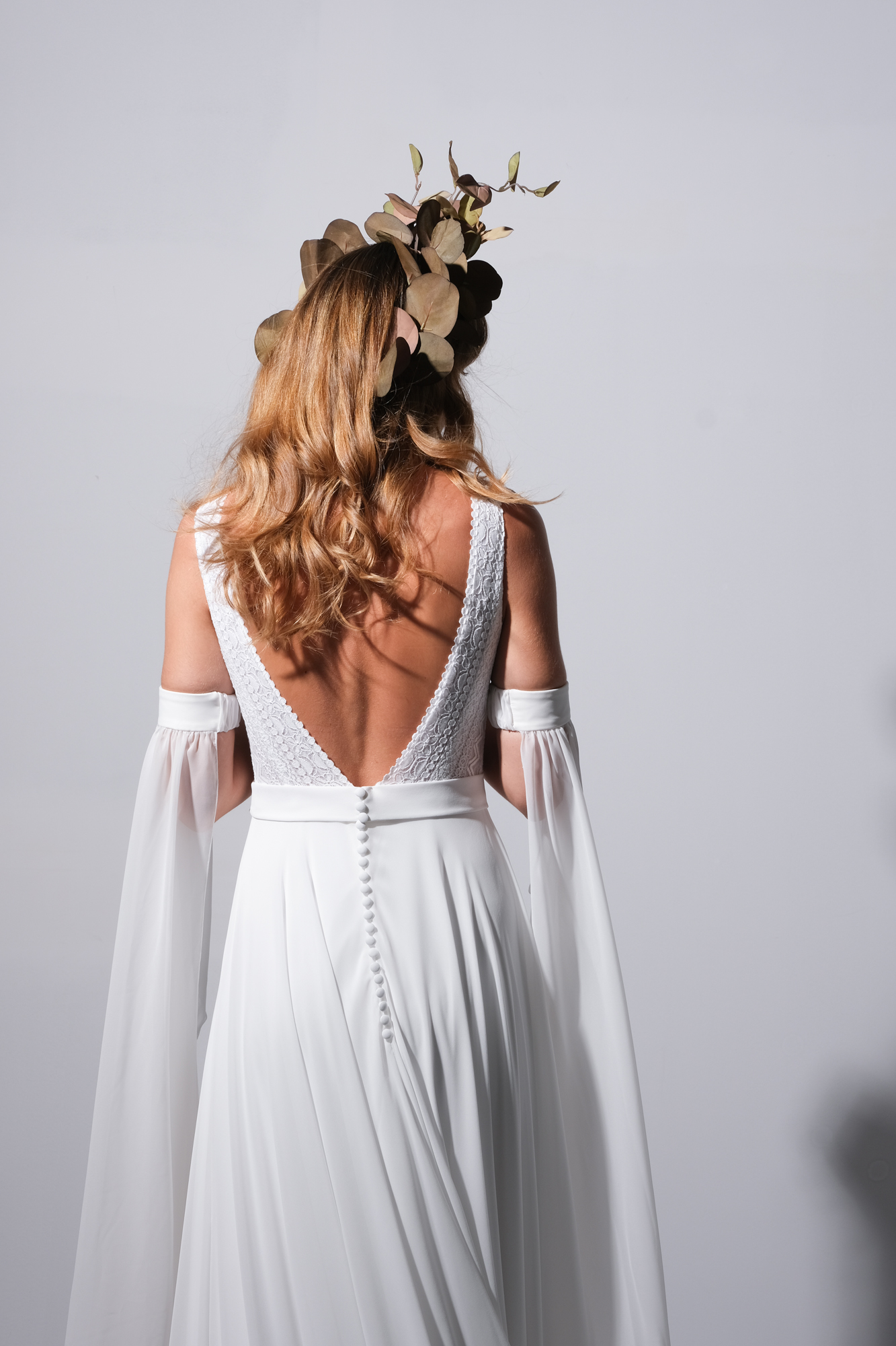 Un estilo romántico caracteriza al vestido de boda Mora. Con un marcado escote y espalda en V, encajes delicados a través del vestido, que pueden complementarse con unas mangas extraíbles de gasa ligeras y bohemias.