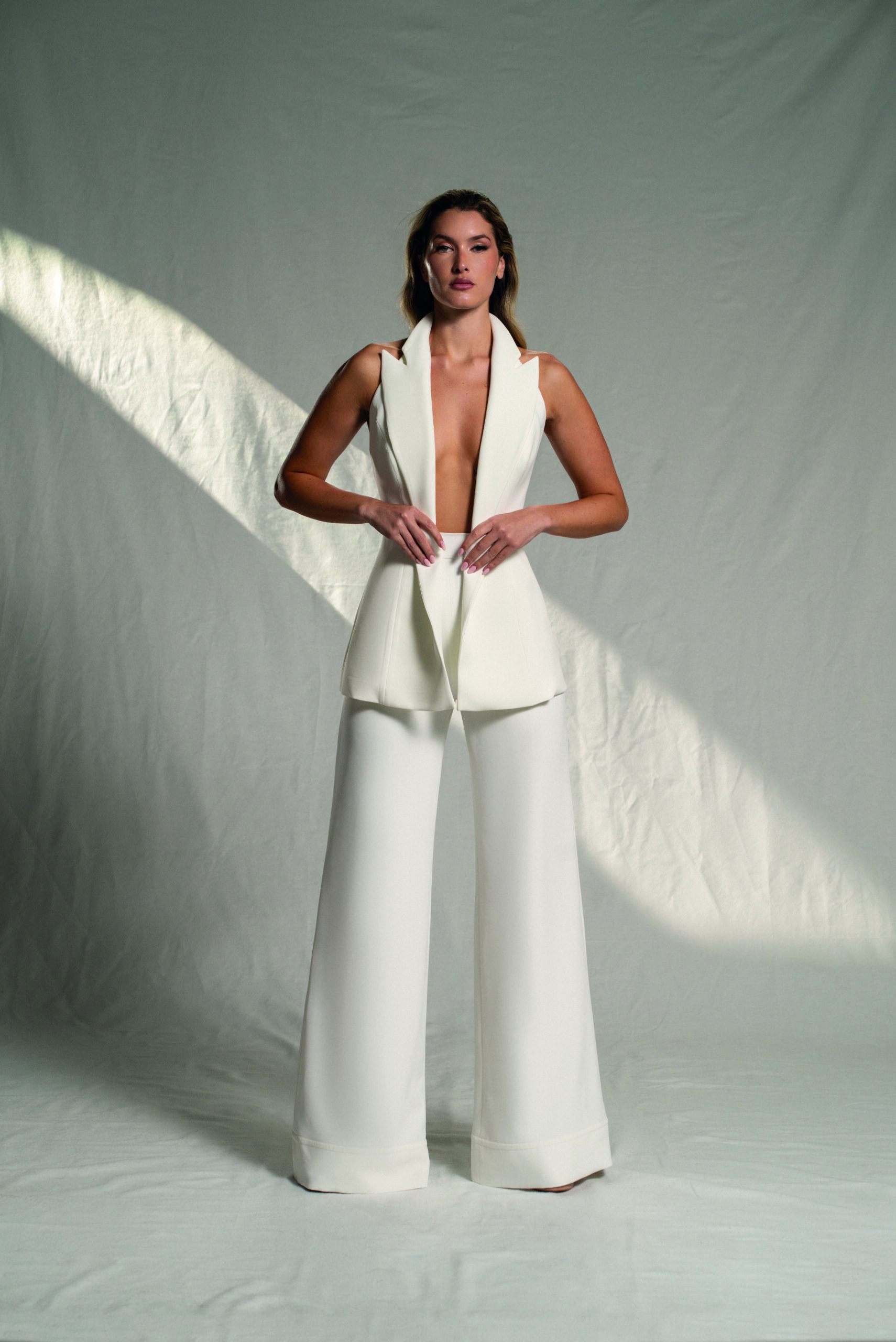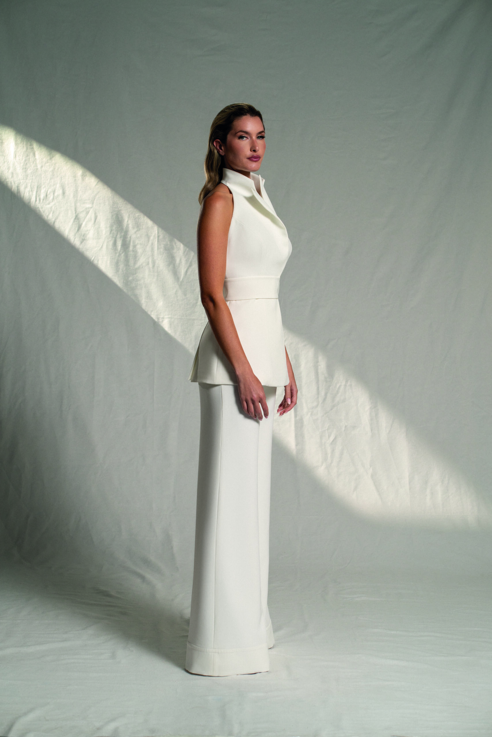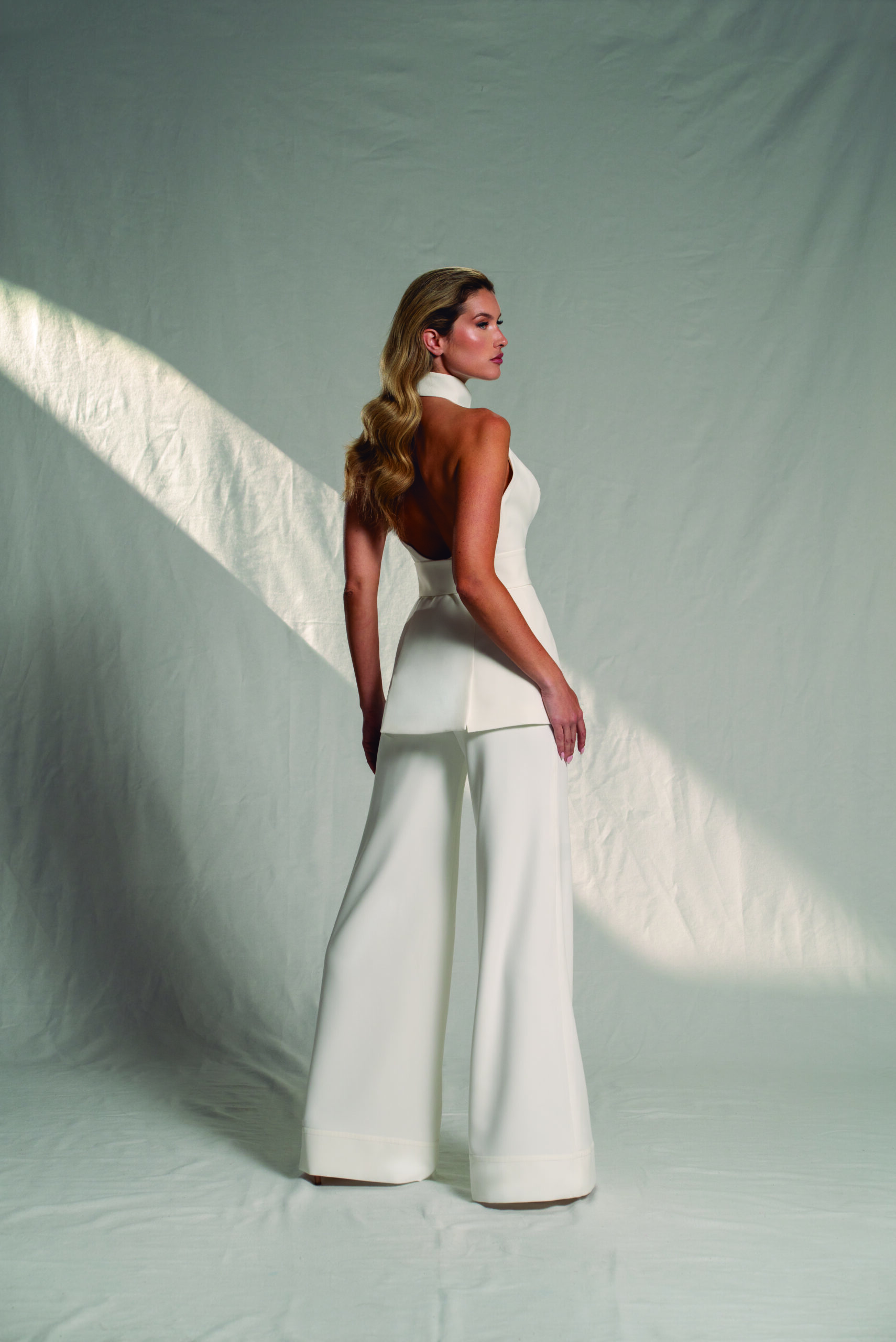 Este conjunto de novia dos piezas es la apuesta perfecta para novias que buscan un estilo minimalista y moderno. Confeccionado en crepé liso de alta calidad, ofrece una estética limpia y sofisticada que destaca por su elegancia sin excesos.