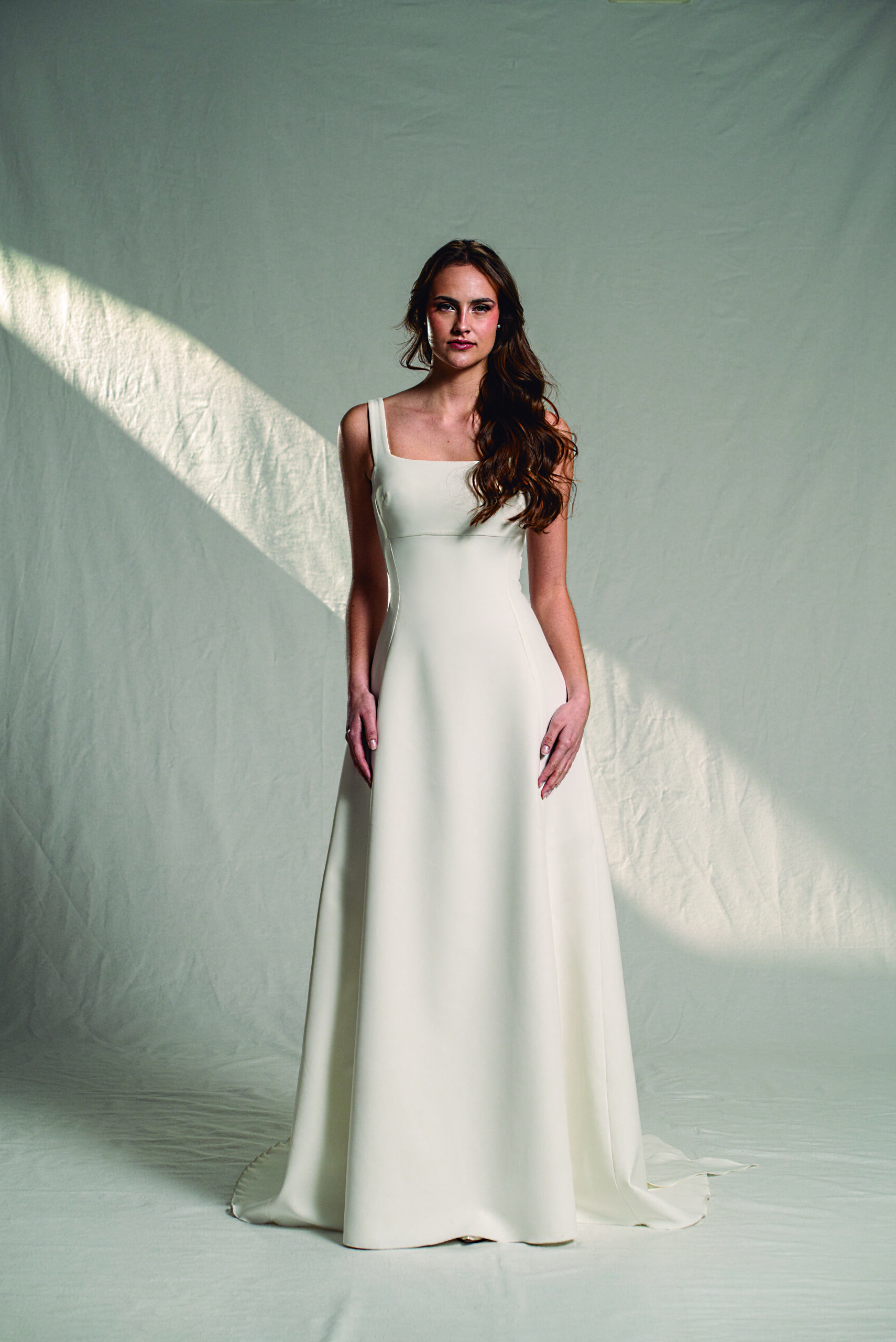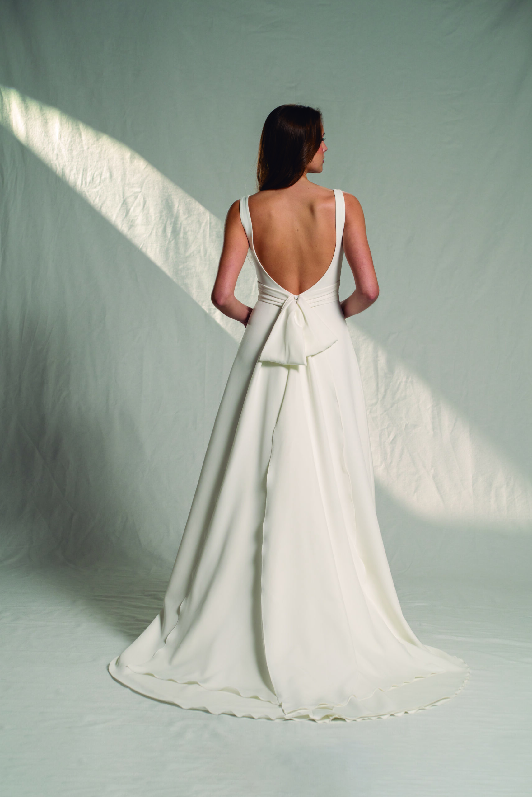 Este vestido de novia se distingue por su estética minimalista y depurada, ideal para quienes buscan una elegancia contemporánea sin exceso de adornos. Confeccionado en crepé de alta calidad, su textura suave y fluida aporta una caída natural que realza la silueta con discreción y sofisticación.