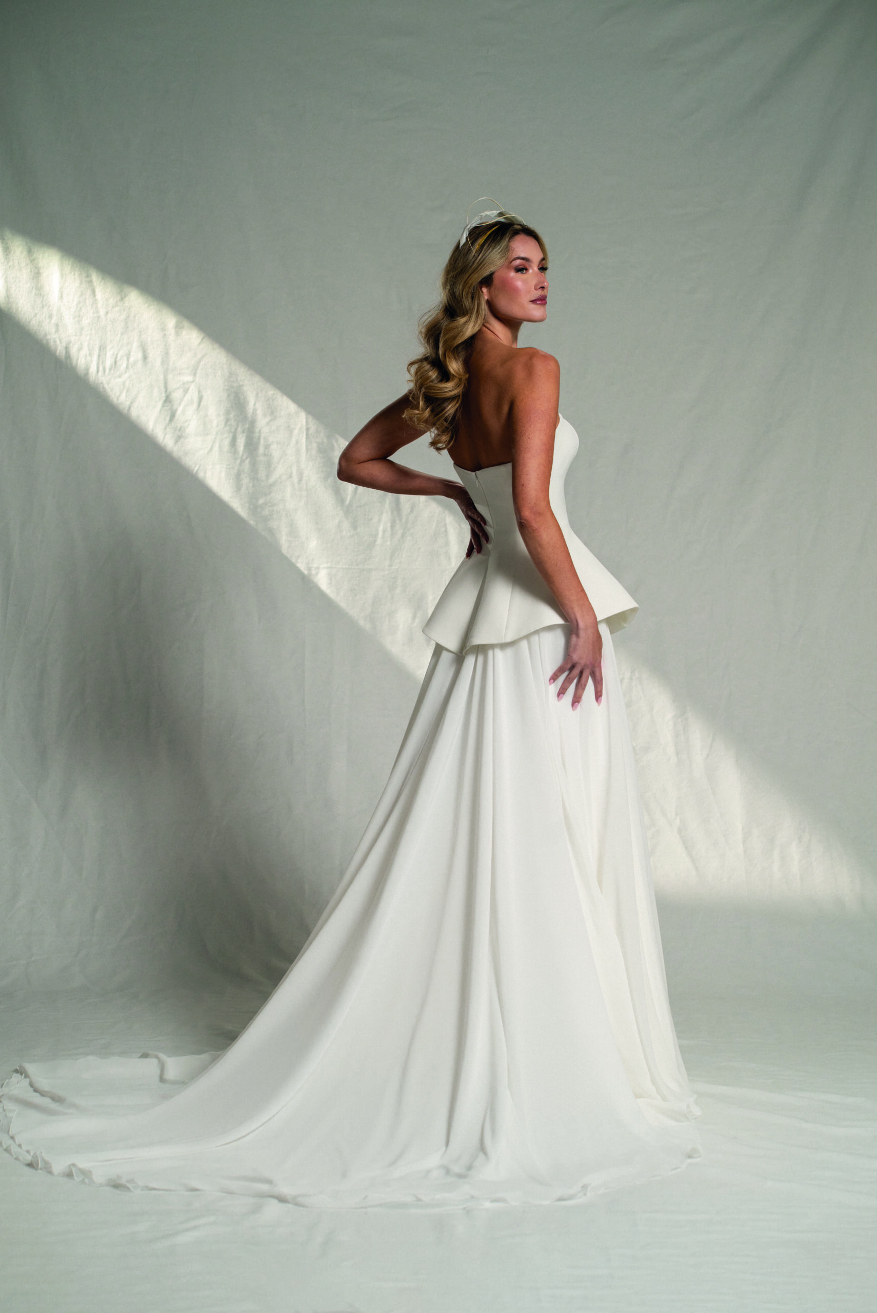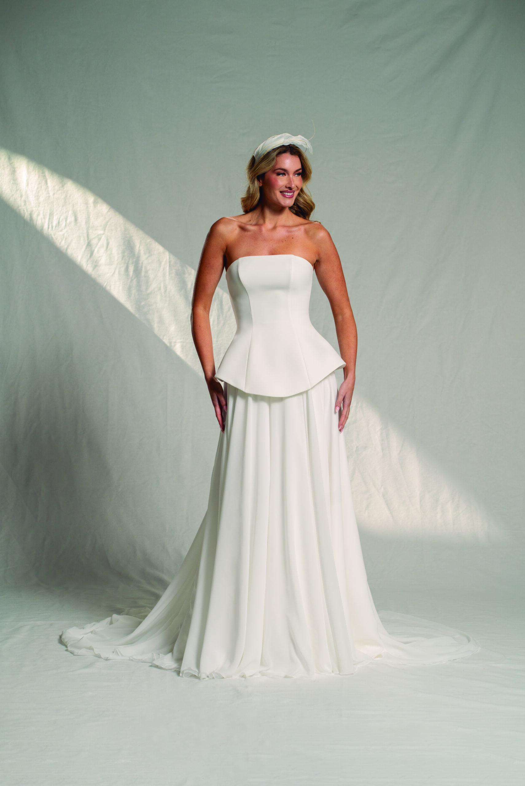 Este conjunto de novia de dos piezas es una propuesta minimalista y contemporánea para novias que buscan un estilo diferente sin renunciar a la elegancia. El top palabra de honor, limpio y estructurado, se combina con una falda de corte en A confeccionada en capas de crepé y gasa, creando un equilibrio perfecto entre fluidez y definición.