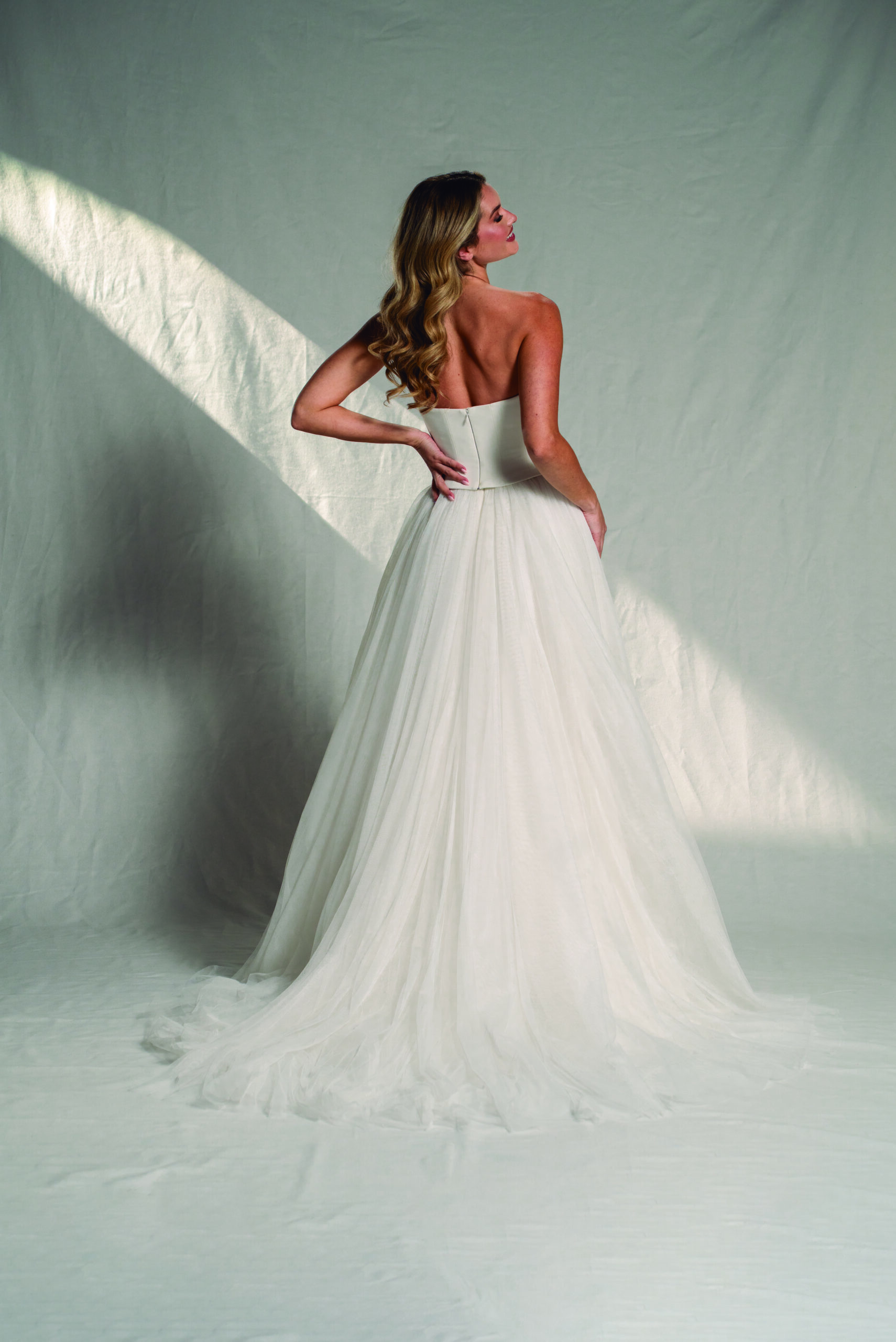 La falda, confeccionada en tul ligero, cae suavemente desde la cintura y se abre con una discreta abertura que añade movimiento y sensualidad sin perder la elegancia. Su confección lisa y sin recargos permite que los materiales y la silueta sean los protagonistas, logrando un equilibrio perfecto entre sofisticación y sencillez.